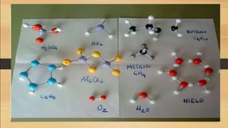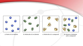 The document defines key chemistry terms including atoms, molecules, elements, compounds, mixtures and solutions. Atoms are the smallest unit of matter that cannot be divided further. Molecules are formed when two or more atoms combine chemically. Matter is made up of elements, compounds, mixtures and solutions. Elements are made of the same type of atom, compounds contain two or more types of atoms bonded together with a specific chemical formula. Mixtures contain substances that are not chemically combined, while solutions occur when a substance dissolves evenly in another.
