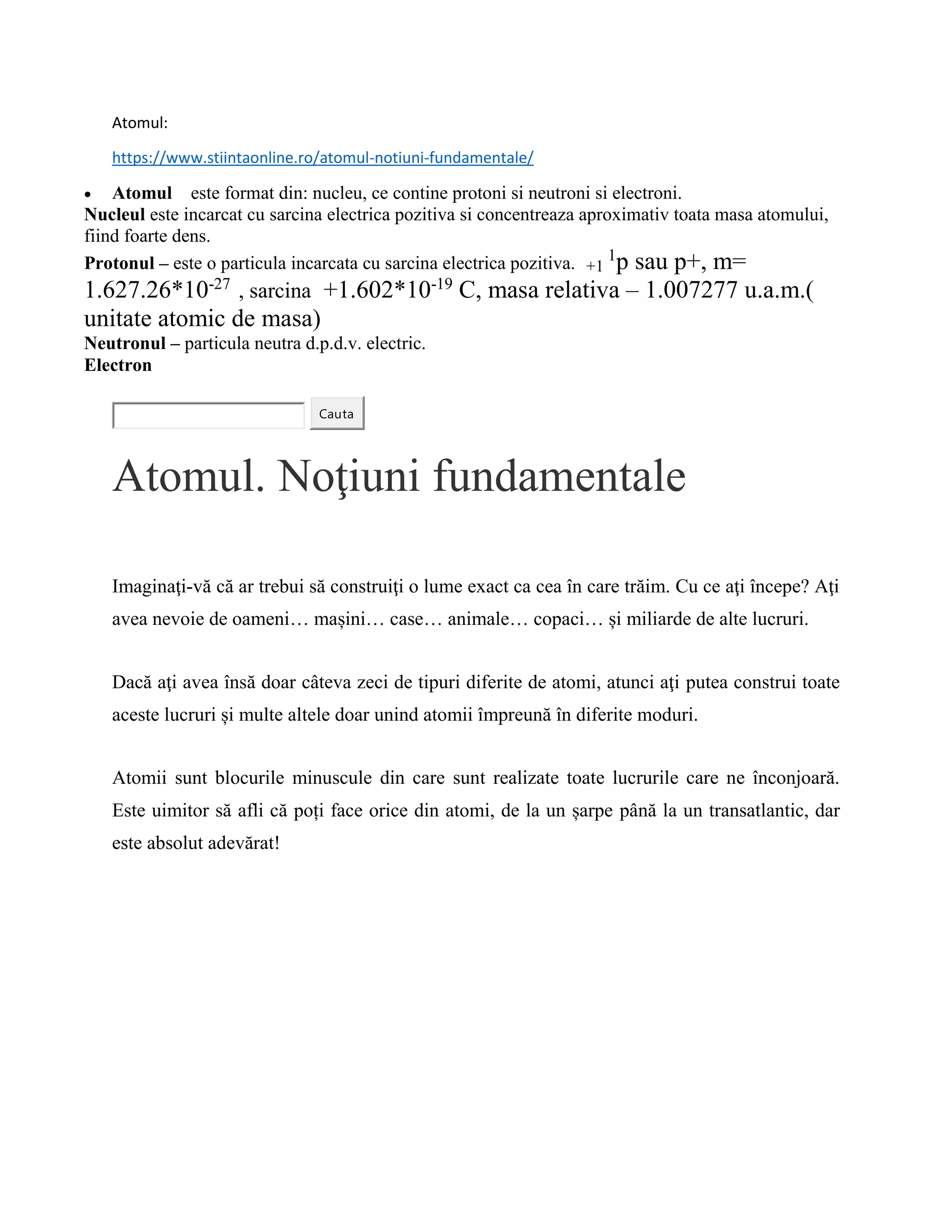 Atomul este constituit din nucleu (format din protoni și neutroni) și electroni, iar fiecare atom este cea mai mică unitate a unui element chimic. Atomii diferă între ei prin numărul de protoni, neutri și electroni, ceea ce determină identitatea chimică și proprietățile lor. Moleculele sunt formate prin unirea atomilor, iar compușii chimici rezultă din combinații specifice ale acestora.