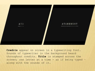 The opening scene of Atonement establishes the setting of a wealthy British family in the 1930s through shots of an elaborate dollhouse and toys that belong to the main character Briony. The audience learns that Briony is writing a play through the sounds of typing and an extreme close-up of her face. Briony is then seen walking through the large and ornate family home, interacting with the staff in the kitchen and encountering a young man in the garden who she seems familiar with, despite his role as a staff member. The scene ends abruptly when Briony shuts the doors to an elaborately decorated room.