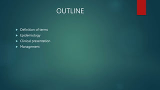 The document provides a comprehensive overview of atopic dermatitis (eczema), including its definition, epidemiology, clinical presentation, and management strategies. It notes that the disease usually presents by age five, with common symptoms including itch and dryness, and emphasizes the importance of proper skin care and potential treatments ranging from mild emollients to systemic immunosuppressants for severe cases. Differential diagnosis with conditions such as seborrhoeic dermatitis is also discussed.