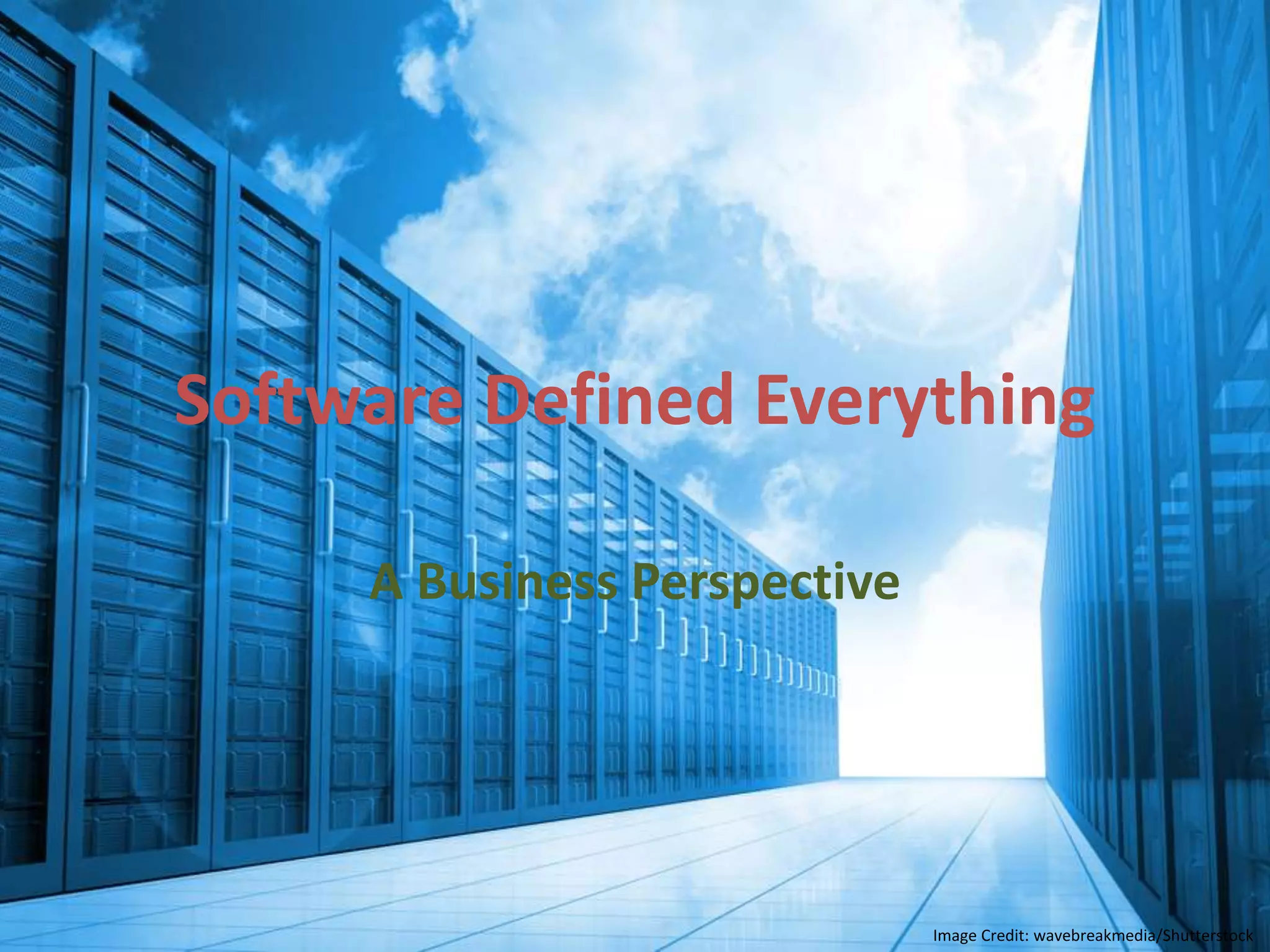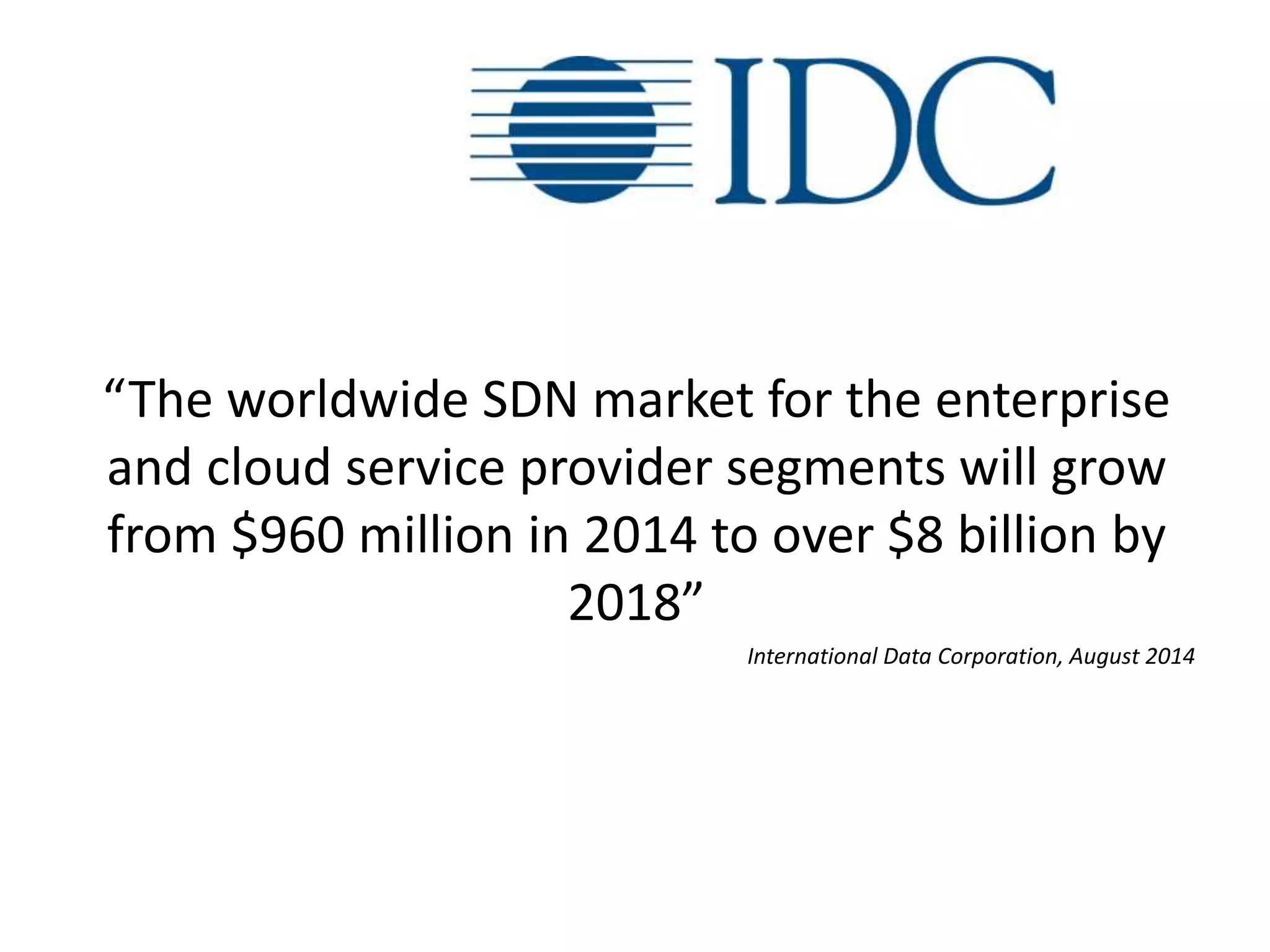 The document discusses software defined networking (SDN) and its growth potential. SDN abstracts physical network infrastructure and exposes it through APIs to enable greater automation, policy-based orchestration, and reuse. It aims to increase agility and speed while reducing costs through more efficient use of commodity hardware. The document raises questions about how organizations are implementing SDN in areas like security, automation, availability, utilization, and standards.
