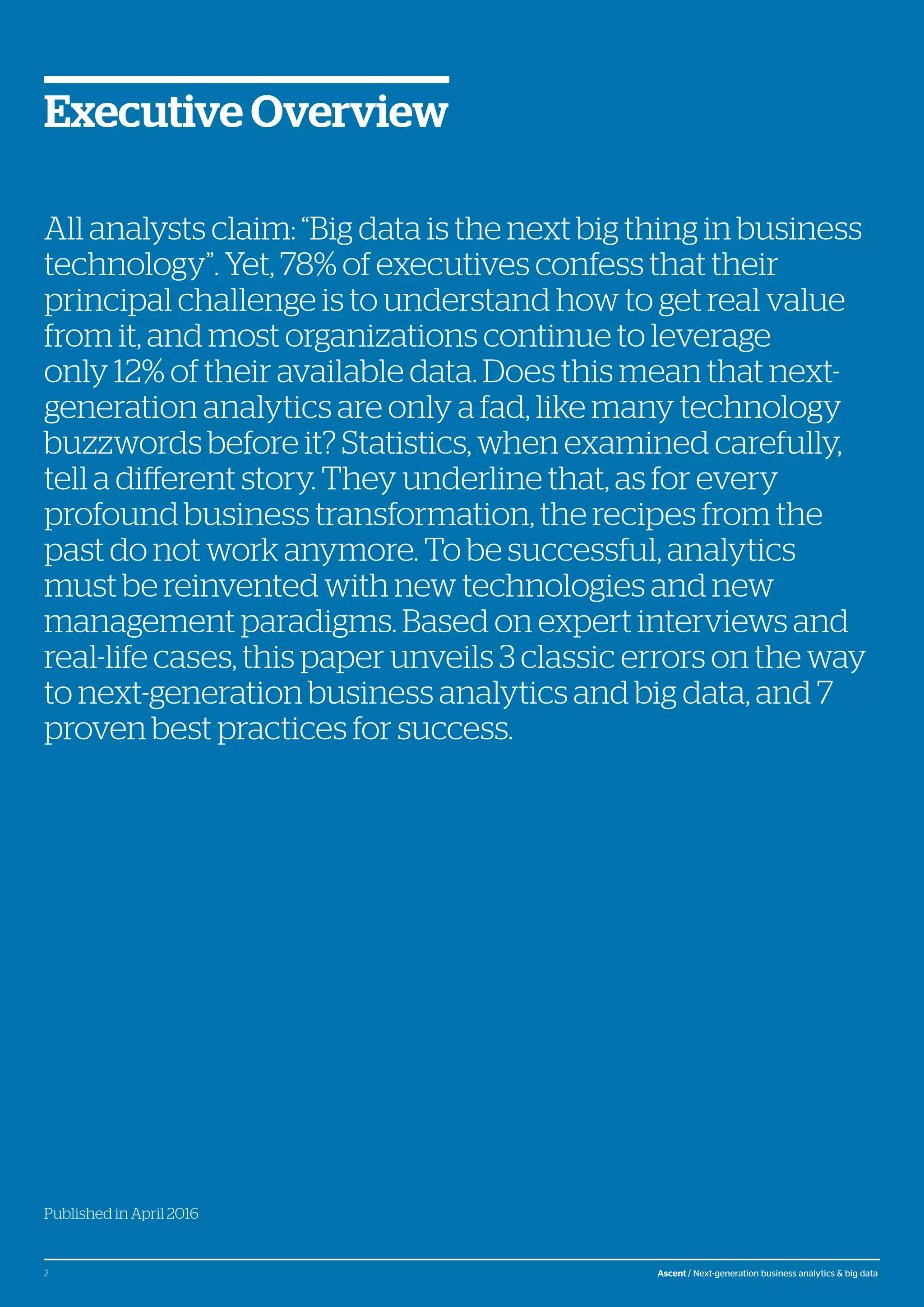 The document discusses best practices for successful next-generation business analytics and big data projects. It identifies three common errors: the "Techno Geek" project that focuses on technology before problems, the "Data Bazaar" project that results in data silos without governance, and the "Late Runner" project that risks falling behind competitors by not innovating quickly enough. It then outlines seven golden rules for success: focus on business insights, get industrialized and flexible systems, differentiate with performance, leverage constant innovation, prioritize security, start small and grow iteratively, and learn from other industries' best practices.