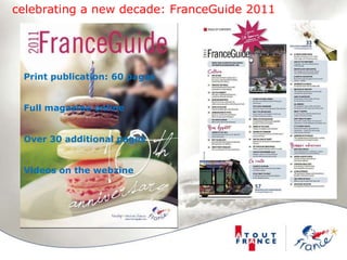 This document summarizes the 10th anniversary issue of FranceGuide 2011, highlighting the magazine's print and online content, interviews, hotel and museum openings, and major exhibitions. The issue celebrates FranceGuide's decade of coverage on topics of interest in France, from culture and design to food and practical travel information. It also provides a preview of cultural developments and new sites to look forward to in the coming years.