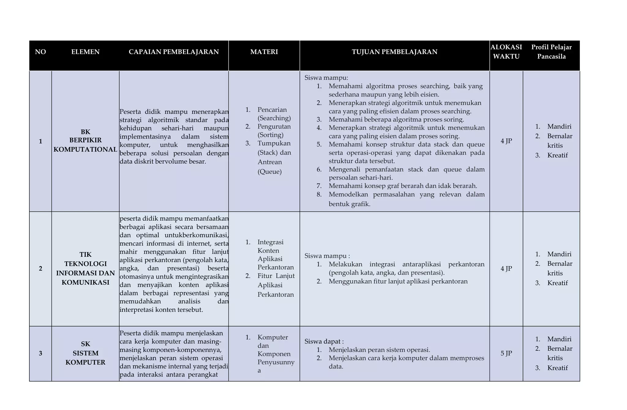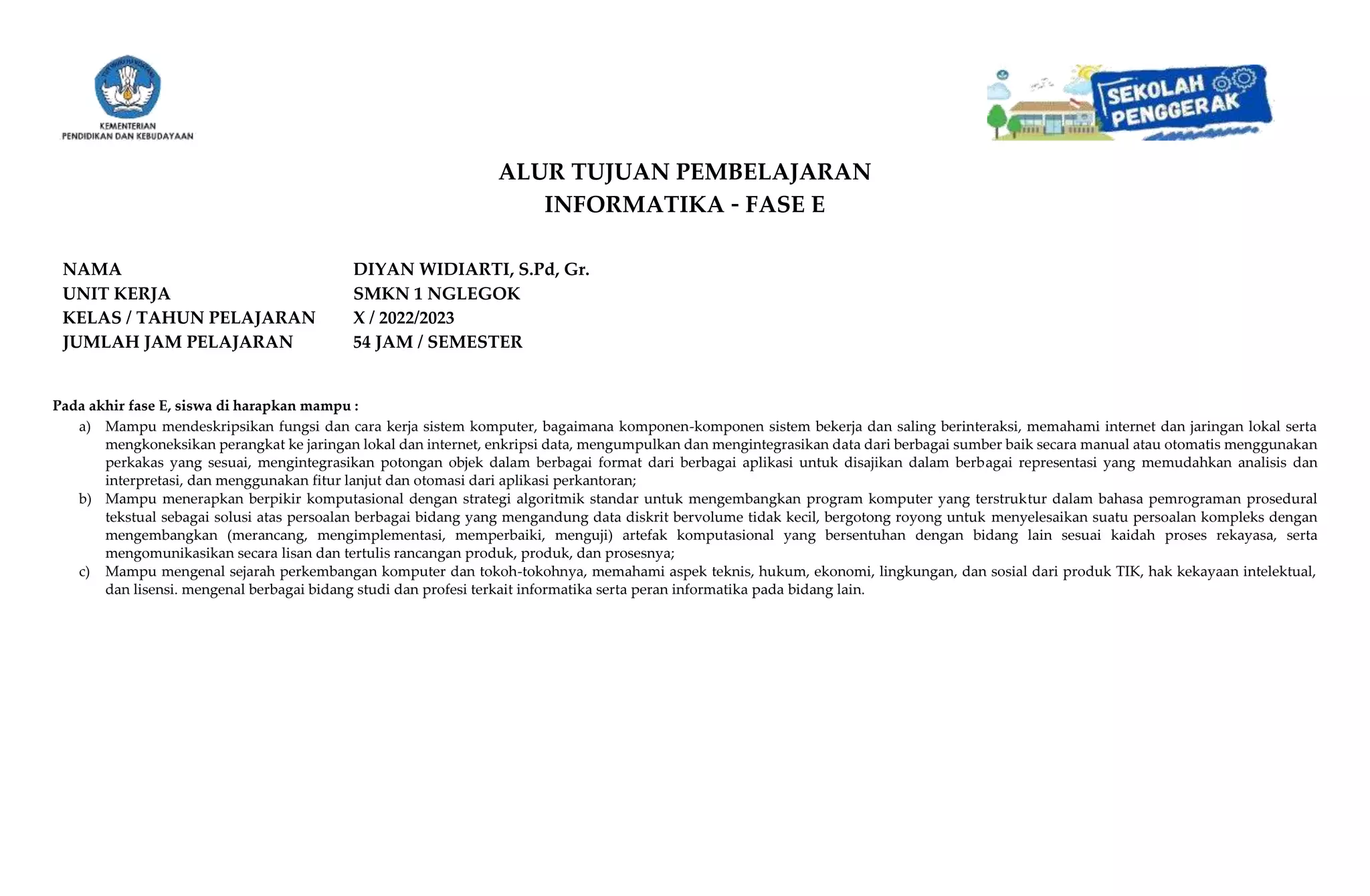 Dokumen ini menggambarkan tujuan pembelajaran informatika untuk siswa kelas X di SMKN 1 Nglegok tahun ajaran 2022/2023, yang mencakup pemahaman tentang sistem komputer, algoritma, jaringan internet, serta analisis data. Siswa diharapkan mampu menerapkan pengetahuan teknis dan strategi algoritmik untuk menyelesaikan masalah nyata, serta bekerja sama dalam tim untuk mengembangkan solusi komputasi. Pembelajaran ini juga menekankan pentingnya kolaborasi, kreativitas, dan etika dalam penggunaan teknologi informasi.