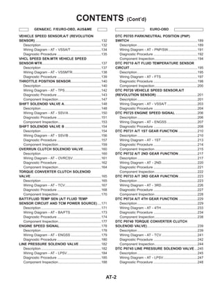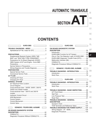 This document provides information about the automatic transmission system for certain vehicle models. It includes sections on overall system operation, control systems, diagnostic trouble codes, troubleshooting procedures, component repair, and specifications. The document contains wiring diagrams, descriptions of components and circuits, diagnostic flow charts, specifications, and repair procedures.
