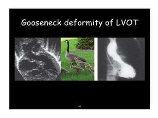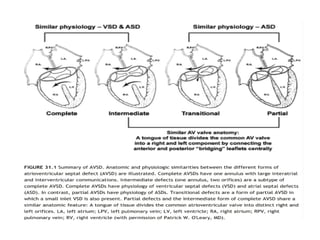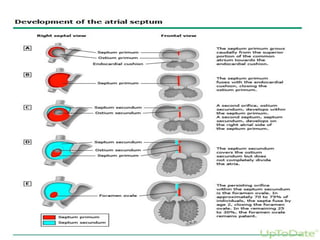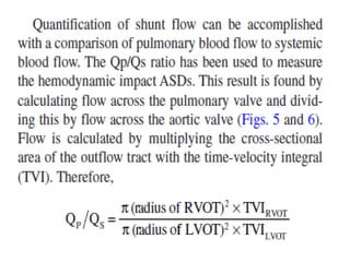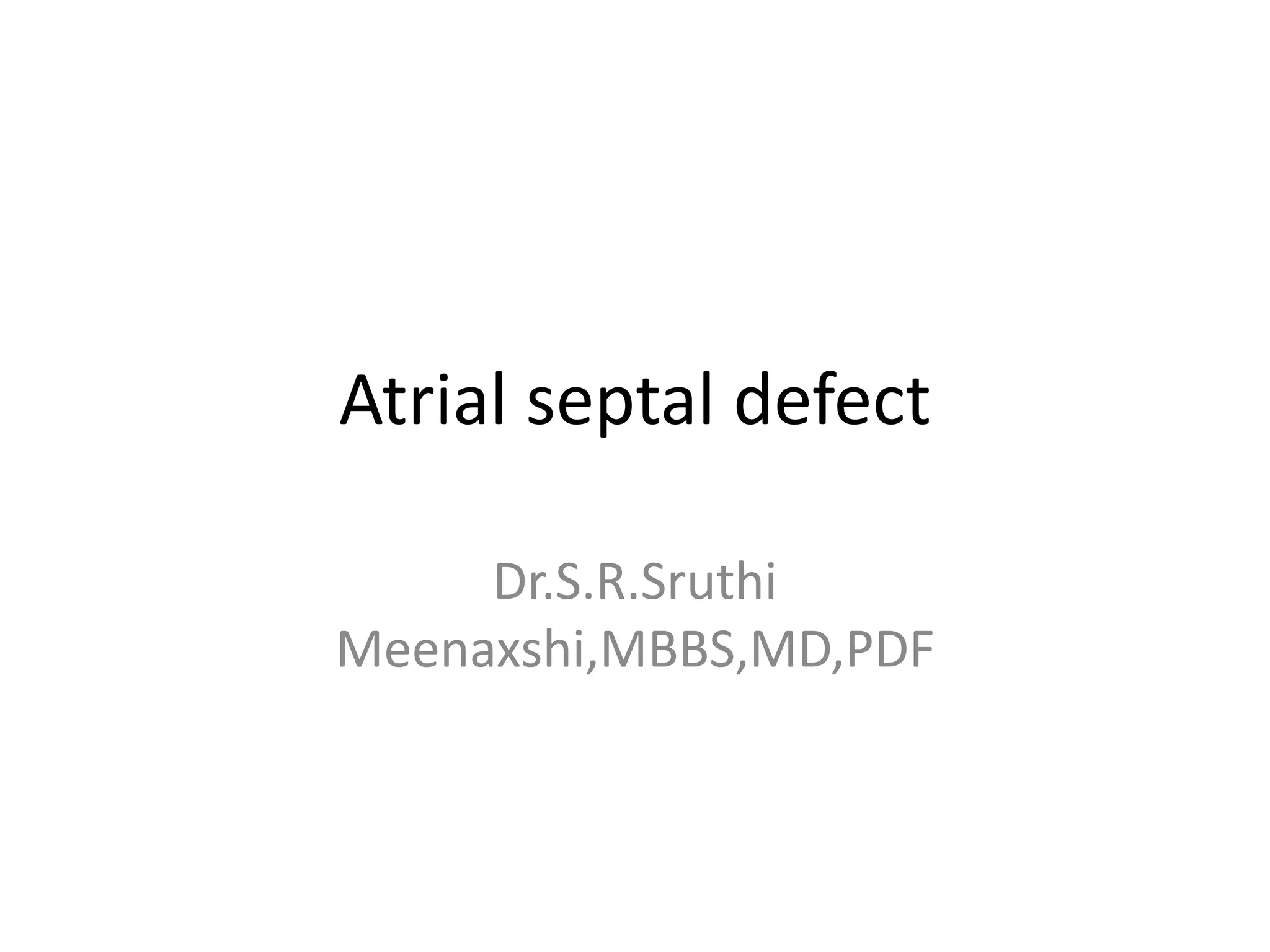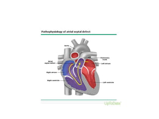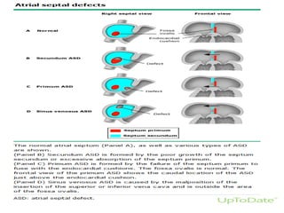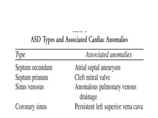 This document discusses atrial septal defects (ASDs), which are openings in the septum separating the left and right atria of the heart. It describes the different types of ASDs based on their location, including secundum, primum, sinus venosus, and coronary sinus defects. It discusses the embryology, pathophysiology, natural history, diagnosis and ECG findings of each type. Secundum ASDs are the most common and may close spontaneously in childhood, while primum and sinus venosus defects do not close on their own. Left-to-right shunting can cause right heart volume overload and pulmonary hypertension if not repaired. Echocardiography and ECG