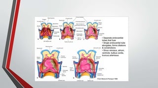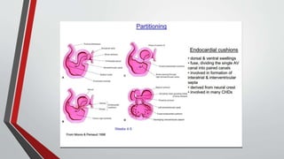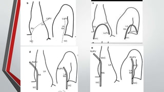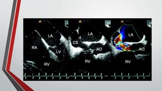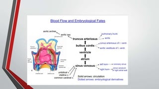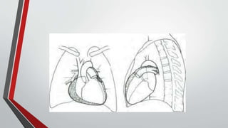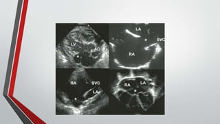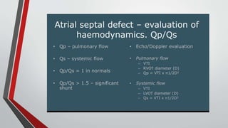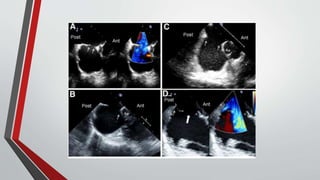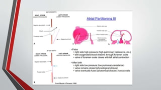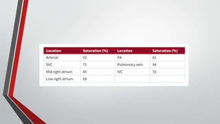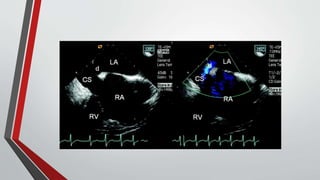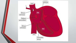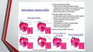 Leonardo da Vinci was the first to document a true atrial septal defect in his writings. The document then describes the normal process of atrial septation during embryonic development and how defects can occur if this process is disrupted. It classifies the main types of atrial septal defects and describes the characteristics, causes and clinical implications of each. Ostium secundum defects are the most common type while sinus venosus and coronary sinus defects are less common. The pathophysiology of left-to-right shunting with an atrial septal defect is explained.