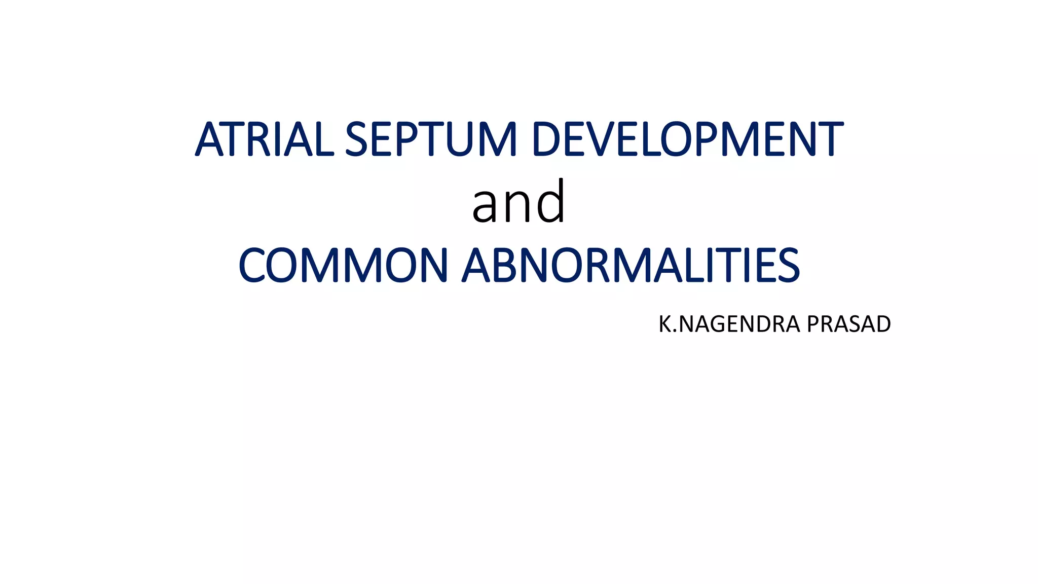 1. The atrial septum normally develops between the 4th and 8th weeks of gestation through the formation of the septum primum and secundum.