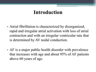 This document discusses atrial fibrillation (AF), a common heart condition where the upper chambers of the heart beat irregularly and too fast. AF can be caused by conditions like heart disease, hypertension, or hyperthyroidism. It occurs when chaotic electrical signals in the atria beat irregularly instead of in a coordinated pattern. Left untreated, AF can lead to heart failure or stroke by reducing cardiac output and allowing blood clots to form. The document classifies AF by duration and discusses its characteristic ECG findings and potential clinical symptoms like fatigue, dizziness, and palpitations.