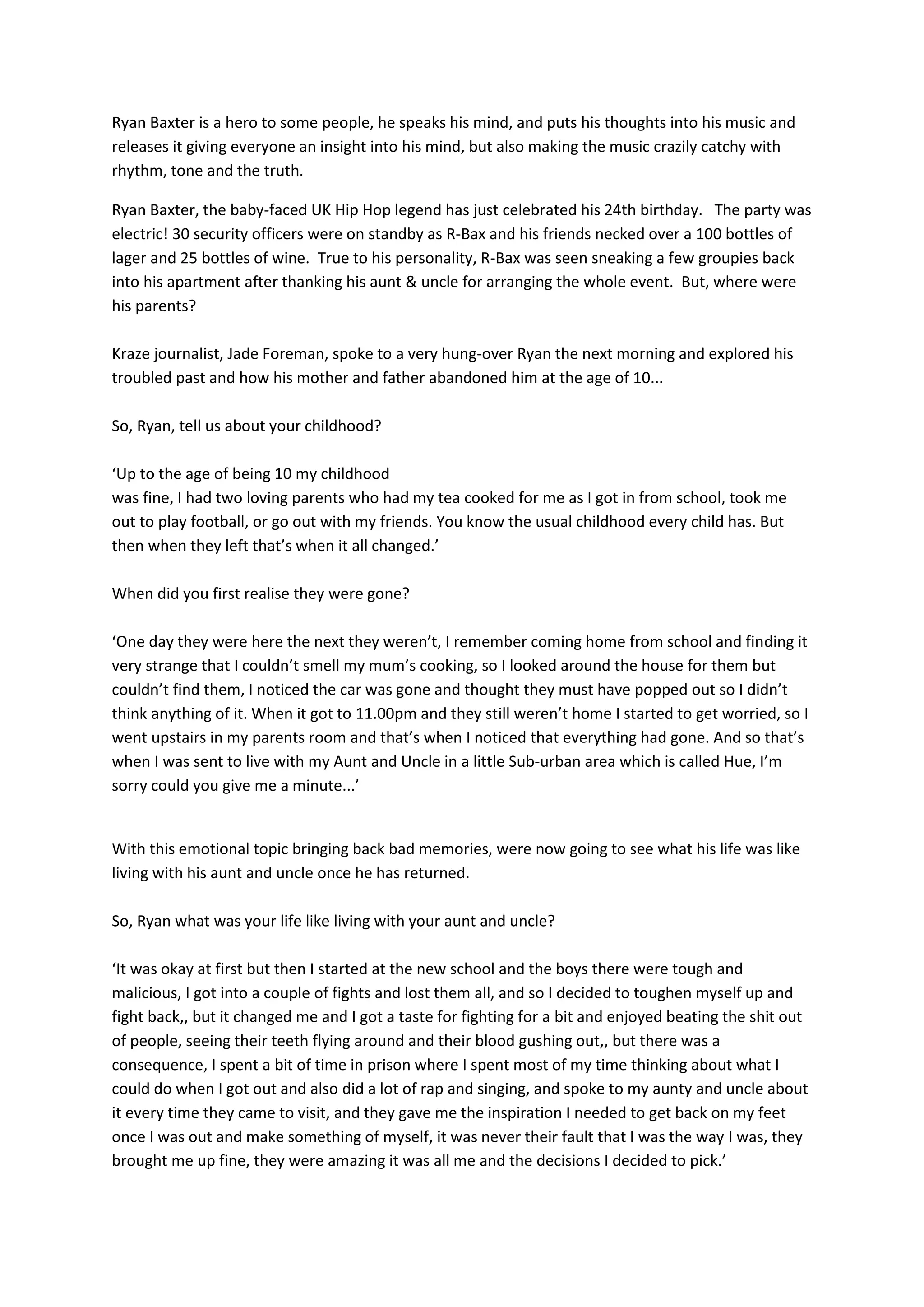 Ryan Baxter is a UK hip hop artist who was abandoned by his parents at age 10. He went to live with his aunt and uncle, but got into fights at his new school and spent time in prison. His new album "Wasted Mistakes" includes the single "Running Away" about his parents leaving him. Though he had a troubled past, Ryan hopes to have children of his own someday and be a better father than his own parents were to him.