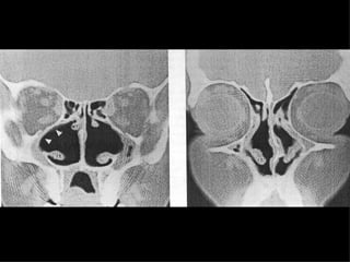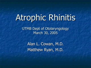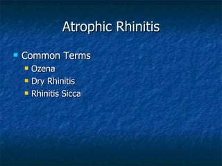 Atrophic rhinitis is a chronic inflammatory disease characterized by crusting, fetor, and atrophy of the nasal structures. It is most commonly caused by complications from prior sinus surgery. On physical exam, patients typically have extensive nasal crusting and anosmia. Radiographic findings include mucosal thickening and bone resorption in the paranasal sinuses. Treatment options aim to restore nasal hydration and minimize crusting, using topical therapies like saline irrigations and systemic antibiotics. Surgical therapies include closure of the nostrils or implantation of materials to increase nasal volume.