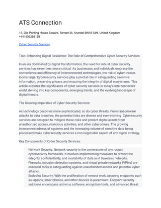 The document emphasizes the critical importance of comprehensive cybersecurity services in the rapidly evolving digital landscape, highlighting key components such as network security, endpoint protection, data safeguarding, and identity management. It discusses emerging trends like artificial intelligence, zero trust security, cloud security, and IoT security, reflecting the growing sophistication of cyber threats. The conclusion stresses the necessity for organizations to adopt proactive cybersecurity measures to protect digital assets and maintain stakeholder trust.