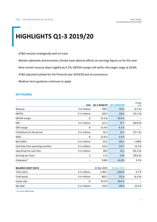 - AT&S reported lower revenue and earnings for the first nine months of the 2019/20 financial year compared to the same period last year, due to market upheavals and the economic climate. Revenue was down 4.7% and EBITDA declined 29.1%.