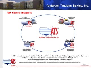 ATS Logistics Services is a transportation and logistics company with over 55 years of experience. It has multiple operating divisions including specialized heavy haul, wind energy logistics, rail, and international transportation. ATS maintains a large fleet of equipment and contracts over 20,000 carriers to offer customers solutions for transportation needs by road, rail, ocean, or air worldwide. Key services include freight brokerage, transportation management, and supply chain management.