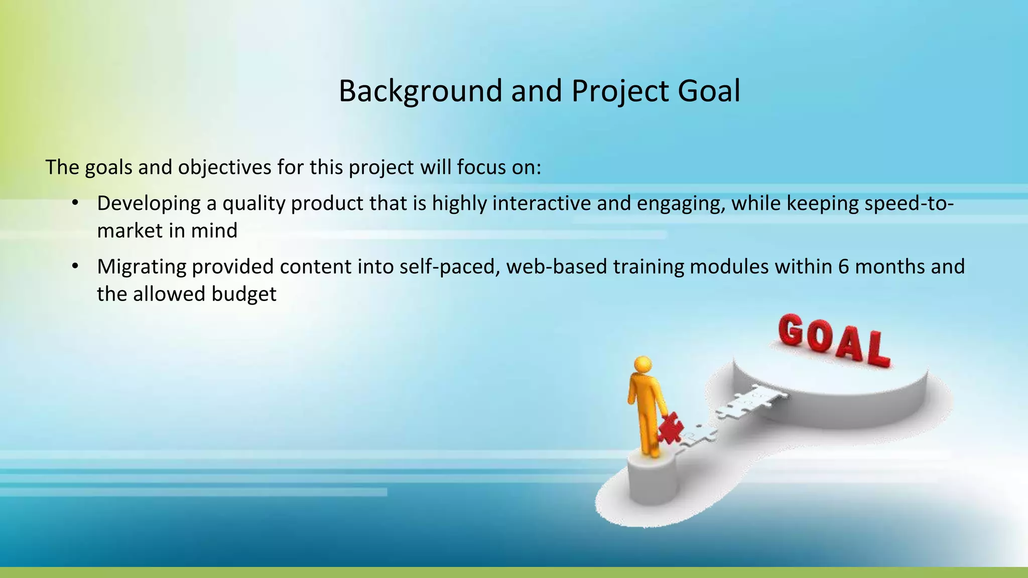 The document outlines a high-level design for developing interactive web-based training modules for pharmaceutical professionals, focusing on producing six courses comprising 24 hours of content within a six-month timeframe. The training strategy includes various instructional methods, such as self-guided learning and mentorship, with assessments integrated throughout the modules. Courses will be designed for English-speaking learners with no prerequisites, ensuring compatibility with major web browsers and adherence to SCORM 1.2 standards.