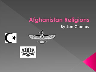 The document discusses the religious demographics and practices in Afghanistan. It notes that Islam is the dominant religion, with the majority being Sunni Muslim and a significant Shia Muslim minority as well. It provides population statistics for major ethnic groups in Afghanistan, many of which are defined by their religious affiliations. The document also outlines some of the key differences between Sunni and Shia Islam, and mentions other minority religious groups in Afghanistan such as Buddhists and Zoroastrians.