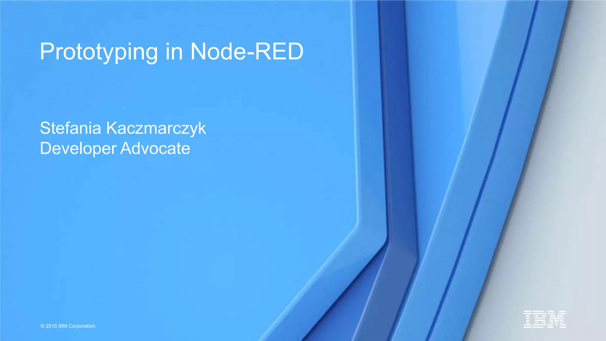 This document provides an overview of prototyping with Node-RED, including setting up a boilerplate Node-RED application on Bluemix, editing code locally, deploying the application, adding new nodes, calling APIs to get weather data from the Weather Company and storing it in Cloudant, and then displaying the data in a Google chart. Key steps include downloading starter code, adding node packages to package.json, pushing the application to Bluemix, making API calls to get data, parsing the response to JSON, trimming the data, storing it in a Cloudant database, and retrieving the data to display in a chart.