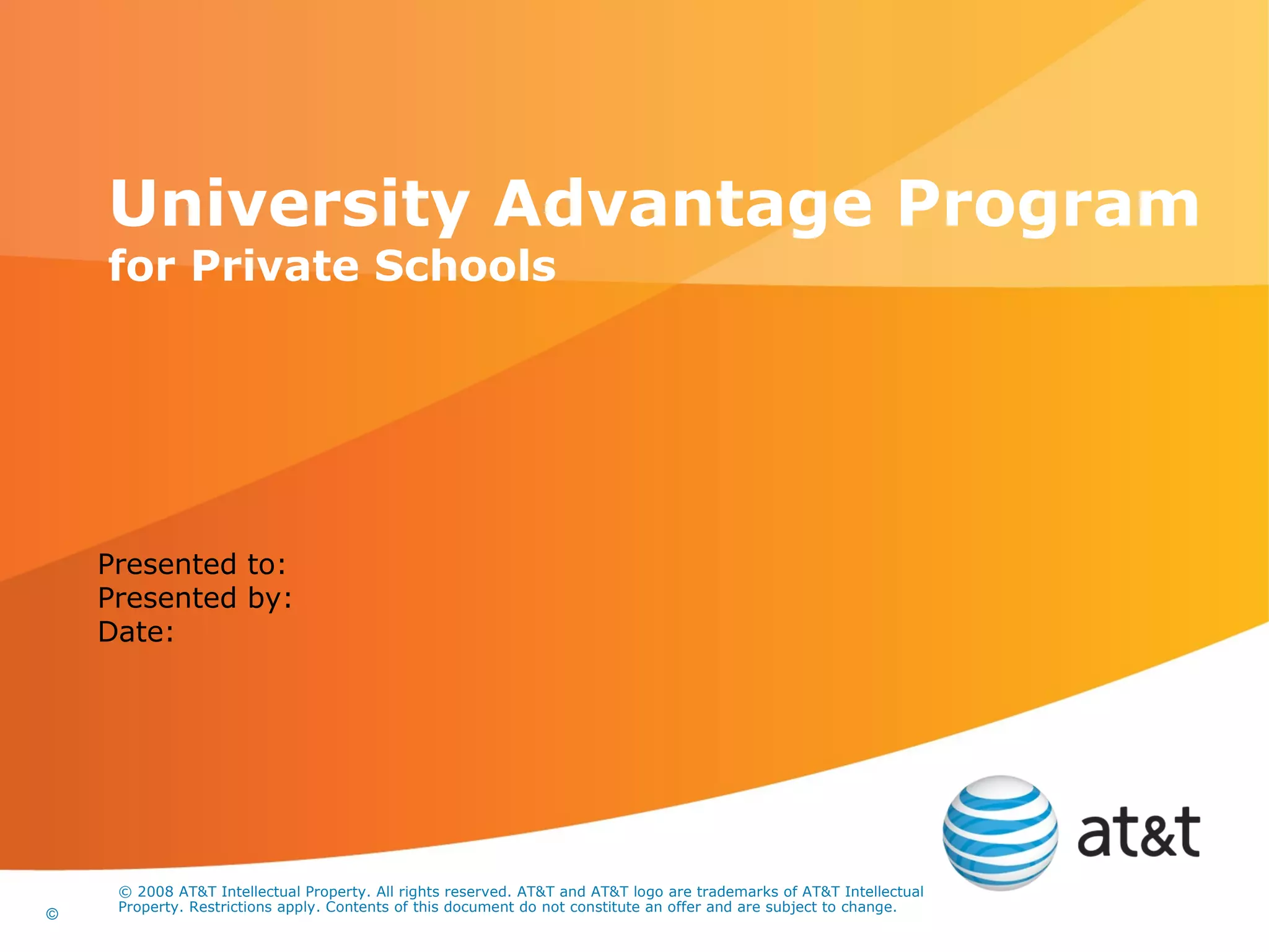 This document summarizes the University Advantage Program offered by AT&T for private schools. It provides details on aggressive government level pricing for private schools with discounts of 20% for corporate users and 15% for individual users. Student discounts of up to 10% are available based on the total number of lines committed to by the school. It also outlines data features and equipment pricing available to participating schools through the program.