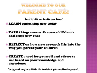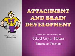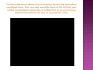 This document summarizes a meeting between parents and facilitators from the School City of Hobart Parents as Teachers program. The goals of the meeting were to learn from each other, discuss new research on parenting, and identify nurturing parenting behaviors that positively impact children's development. Attendees observed video examples of parent-child interactions and discussed how a nurturing relationship is linked to improved memory, stress response and brain development in children. Parents collaborated to identify their top nurturing parenting behaviors to focus on, such as responding warmly to a child's cues, in order to create healthier families and community.