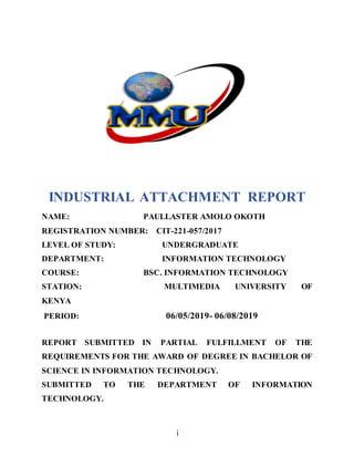 This industrial attachment report presents the internship experience of Paullaster A. Okoth at Multimedia University of Kenya from May 6 to August 6, 2019, aimed at fulfilling the requirements for a Bachelor of Science in Information Technology. The report outlines his daily tasks, including troubleshooting computer issues, network configurations, and hardware maintenance, while also acknowledging the support received during his tenure. Overall, the internship provided practical insights into applying theoretical knowledge in an industrial setting, enhancing the intern's skills and professional network.