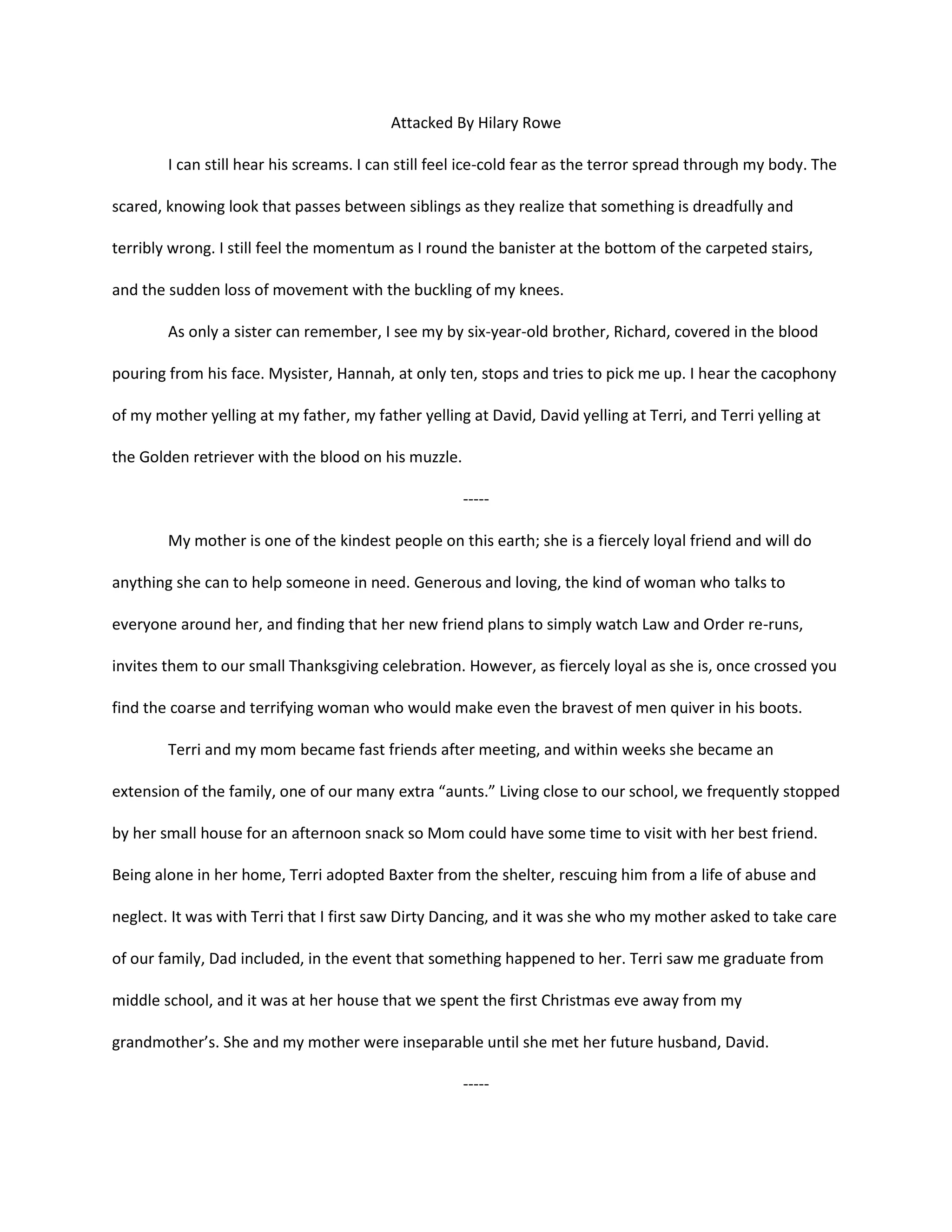 1) The narrator describes coming home to find her 6-year-old brother Richard covered in blood, having been attacked by Terri's dog Baxter. They rush Richard to the hospital.