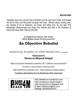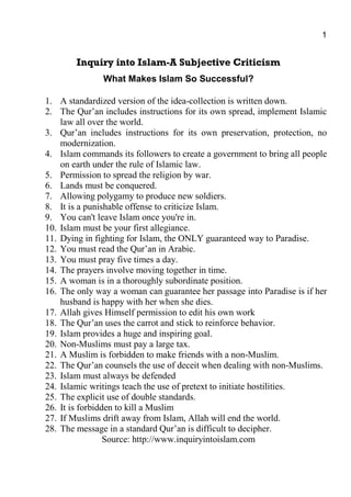 This document presents an objective rebuttal to a subjective inquiry into Islam. It begins by providing context about the 9/11 terrorist attacks and subsequent wars. It notes that terrorists have misused the name of Islam to justify their actions, despite killing innocent Muslims. The rebuttal then analyzes 28 points of criticism about Islam from the website "An Inquiry into Islam". It aims to address each point objectively by providing proper context and interpretations from the Quran and Islamic scholars, rather than extremist views. The rebuttal stresses that Islam teaches peace and that the majority of Muslims reject extremist doctrines. It seeks to clear misconceptions and redirect focus away from deceitful propaganda against Islam.
