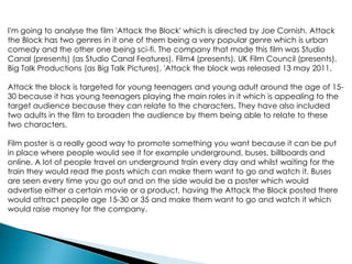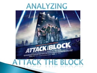 The document analyzes the film poster for "Attack the Block." It discusses how the poster appeals to its target audience of teenagers and young adults aged 15-30 by featuring teenage characters they can relate to and representing urban society through clothing. It also broadens the audience by including two older characters. The poster establishes the sci-fi and urban genres through falling asteroids and the teenagers. It sets the film in London to appeal to local audiences and builds intrigue through a threatening visual style. Comparisons to "Shaun of the Dead" aim to draw in similar audiences.