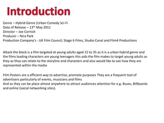 Attack the Block is a 2011 urban comedy sci-fi film directed by Joe Cornish and produced by Nira Park. The film targets young adults aged 15-35 through its story of teenagers in London who must defend their neighborhood from an alien invasion. The movie poster uses various visual elements to appeal to this target audience, such as depicting the teenage characters, including people from different backgrounds, and showing the London skyline. These elements are intended to draw in young viewers and represent urban life while also broadening the audience.