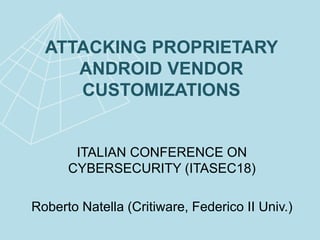 The document discusses attacking proprietary Android vendor customizations through fuzz testing and fault injection testing. It presents Chizpurfle, a gray-box Android fuzzer designed to generate invalid inputs to identify vulnerabilities in vendor customization code without access to source code. Chizpurfle leverages dynamic instrumentation to trace code coverage on actual devices during fuzzing. It detected two bugs from fuzzing Samsung services. The document also discusses a fault injection testing tool that injects faults into Android components to evaluate failure propagation and mitigation. The tool found vendors have varying success in handling faults across components.
