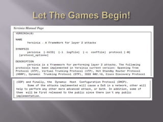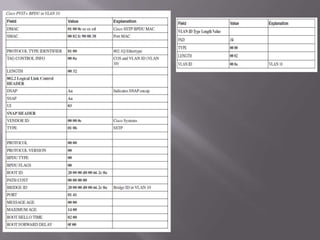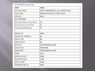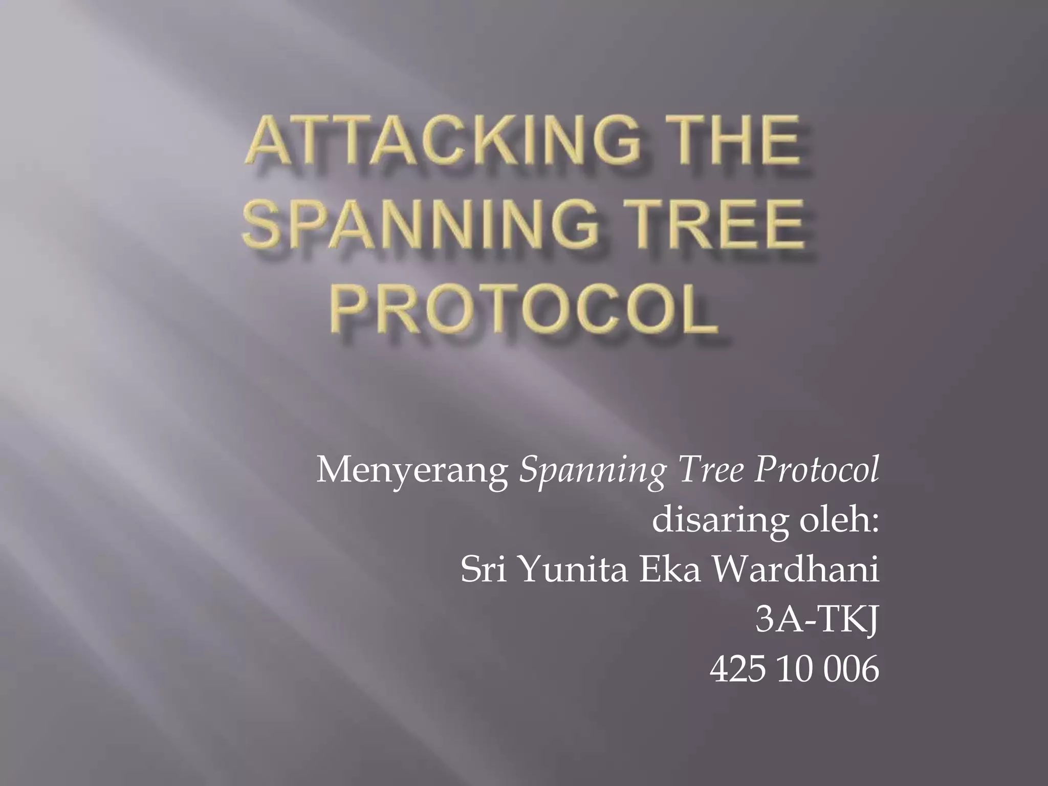 Dokumen ini membahas tentang serangan terhadap Spanning Tree Protocol (STP) dan bagaimana switch Ethernet membangun tabel penerusan mereka. Termasuk di dalamnya mekanisme dan tahapan STP, serta berbagai serangan yang dapat diluncurkan, seperti pengambilalihan root dan DoS. Selain itu, dokumen ini menggambarkan langkah-langkah pertahanan seperti bpdu-guard dan portfast untuk melindungi jaringan dari eksploitasi STP.