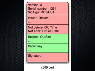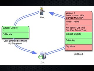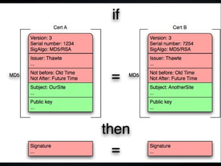 The document discusses various cybersecurity vulnerabilities and attacks, particularly focusing on x509 certificate attacks utilizing MD5 collisions, which can lead to malicious certification. It also covers exploitation techniques in Windows environments, illustrating privilege escalation through real-mode code execution, as well as vulnerabilities in popular applications like FreeBSD and e107 CMS due to backdoor scripts. Additionally, the document touches on risks in cloud computing services, including poorly secured virtual machine images and potential user data leaks.
