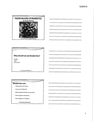This document provides information about blueberries from two websites. The first website, www.extension.org/blueberries, is run by extension services and likely contains growing and agricultural information. The second, www.slideshare.net/AllAboutBlueberries, appears to be a slideshow presentation providing an overview of blueberries.