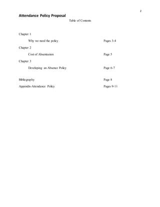This document proposes an attendance policy for a company. It discusses the importance of attendance and the costs of absenteeism, including lost productivity, overtime pay, temporary worker costs, and lower morale. It recommends establishing a formal written policy that clearly outlines allowable absences and consequences. The proposed policy defines excused and unexcused absences, requires employees to notify their supervisor of any absences, and provides guidelines for disciplinary actions after multiple unexcused absences within a 12-month period, with termination possible after the 9th absence.