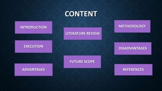 This document discusses the development of an attendance system using radio frequency identification (RFID) technology. It provides an introduction to RFID and describes how RFID can be used to automatically record student attendance, as an improvement over conventional manual systems. The methodology section outlines the key RFID components used, including RFID reader/tags, microcontroller, and other hardware. Features of the RFID-based attendance system are also presented, such as real-time data storage and communication capabilities. Advantages include faster recording of attendance and ability to read data from a distance. Disadvantages and potential future enhancements are also reviewed.