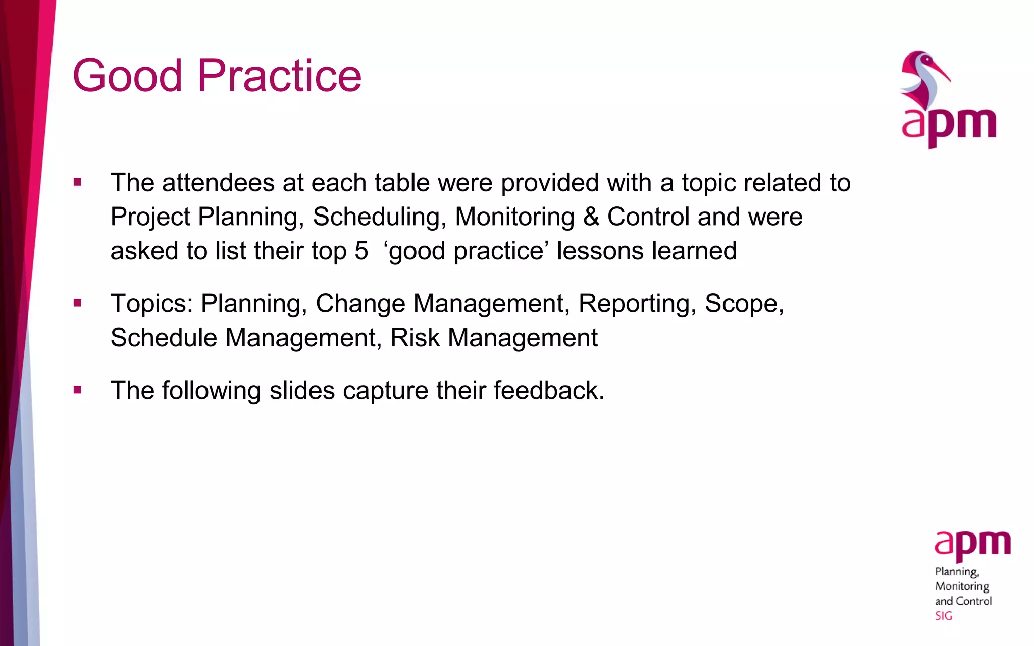 The document outlines essential good practices in project planning, scheduling, monitoring, and control, as derived from attendee feedback during a workshop. It emphasizes key areas such as stakeholder communication, scope management, realistic planning, and effective risk management, while providing specific practices for each area. The feedback highlights the importance of iterative reviews, detailed planning, tailored reporting, and continuous stakeholder engagement throughout the project lifecycle.