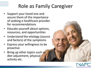Family caregivers play an important role in recognizing and addressing incontinence in their loved ones. They should educate themselves about the symptoms, severity, and potential causes of incontinence. It is important for caregivers to discuss toileting needs openly with patients and ask simple questions to understand their situation better. Proper care involves assessing continence status, documenting any changes, and screening for physical functionality, incontinence severity, and degree of assistance needed with toileting.