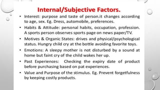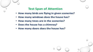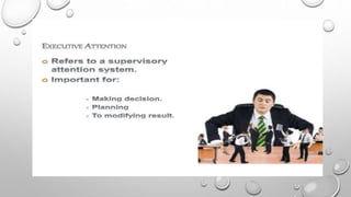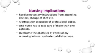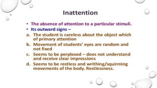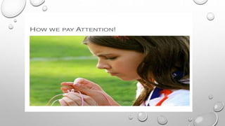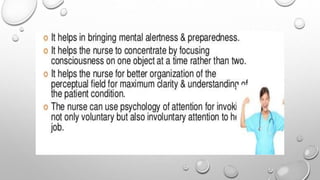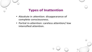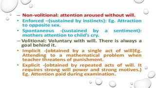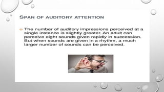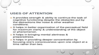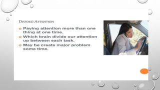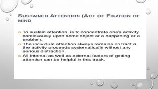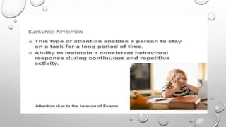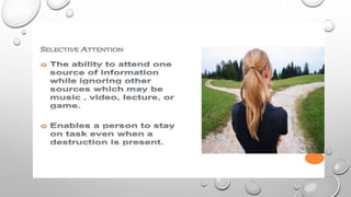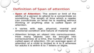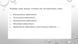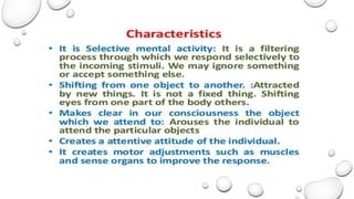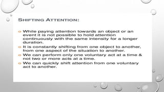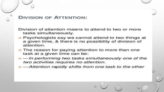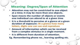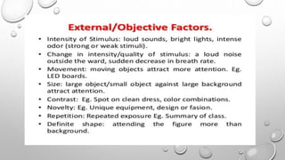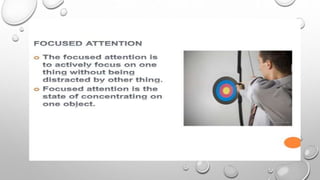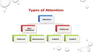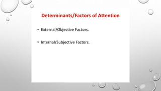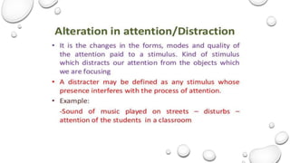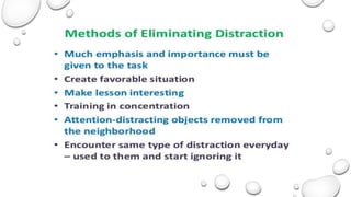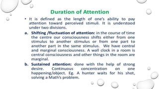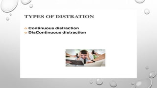 This document defines and discusses the key concepts of attention and distraction. It begins by defining attention as the concentration of consciousness on one object rather than others. It then outlines the types of attention, including voluntary and involuntary, and lists some of the main internal and external factors that can influence a person's attention. The document also defines distraction as anything that interferes with attention, and discusses some common sources of distraction both external and internal. It concludes by mentioning the span of attention and how it represents the limit of how long a person can concentrate on something.