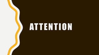 This document provides information about attention and attention span. It defines attention as the process of concentrating on a specific topic or object. It discusses the determinants of attention, including external factors like the nature, intensity and movement of a stimulus as well as internal factors such as interest, motives, mindset and moods. It describes two types of attention: non-volitional/involuntary attention that occurs without willpower and volitional/voluntary attention that requires conscious effort. Finally, it defines attention span as the amount of time a person can focus on a single task and notes that a short attention span is a symptom of conditions like ADD and ADHD.