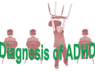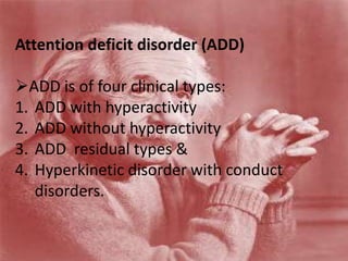 This document discusses attention deficit disorder (ADD), including its four types and their characteristics. It provides details on symptoms, causes, diagnosis criteria, and treatment approaches for ADD with hyperactivity (ADHD). Key information includes that ADHD is one of the most common childhood disorders, affecting 3-5% of school-aged children. It involves inattention, hyperactivity, and impulsivity. Treatment may involve behavioral therapy, pharmacological therapy with stimulants or non-stimulants, or a combination approach depending on the child's age. Nursing management focuses on ensuring a safe environment and developing a trusting relationship to encourage the child.