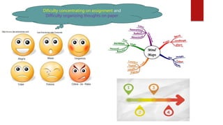 This document discusses some common issues experienced by those with Attention Deficit Hyperactivity Disorder (ADHD), including difficulty concentrating on assignments, organizing thoughts on paper, sustaining work on single tasks, and meeting deadlines. It also notes potential spelling issues and problems during final editing, and provides suggestions such as using spell checkers, dictionaries, thesauruses, and reviewing writing step-by-step.