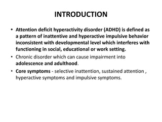 Attention Deficit Hyperactivity Disorder (ADHD) is a chronic condition characterized by inattentiveness, hyperactivity, and impulsivity, affecting individuals from childhood into adulthood. Its etiology includes genetic factors, neuroanatomical differences, and potential environmental influences, and prevalence rates are higher in children than adults. Treatment often involves a combination of pharmacological approaches, primarily stimulants, and behavioral therapies, with ongoing management required to optimize functioning across the lifespan.