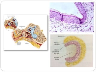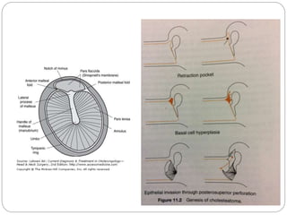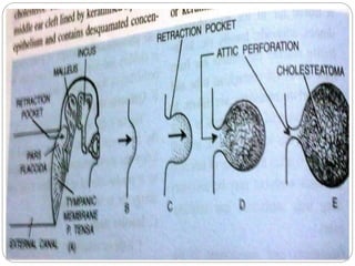 This document discusses chronic suppurative otitis media (CSOM), specifically atticoantral disease. CSOM is characterized by ear discharge and permanent perforation due to long-standing middle ear infection. Atticoantral CSOM involves the attic and antrum regions and poses a higher risk of complications due to bone-eroding processes like cholesteatoma and granulation tissue. Surgical treatment such as atticotomy or mastoidectomy aims to remove disease and render the ear safe, while reconstructive surgery seeks to preserve or restore hearing.