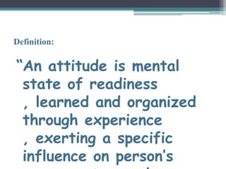 This document defines attitude as a learned mental state influencing behavior, detailing its components: affective, cognitive, and behavioral. It discusses how attitudes are formed through various mechanisms, including direct experience, conditioning, vicarious learning, and social influences such as family, peers, and economic status. Additionally, it highlights the benefits of positive attitudes, functions of attitude, methods for changing attitudes, and approaches to measuring them.