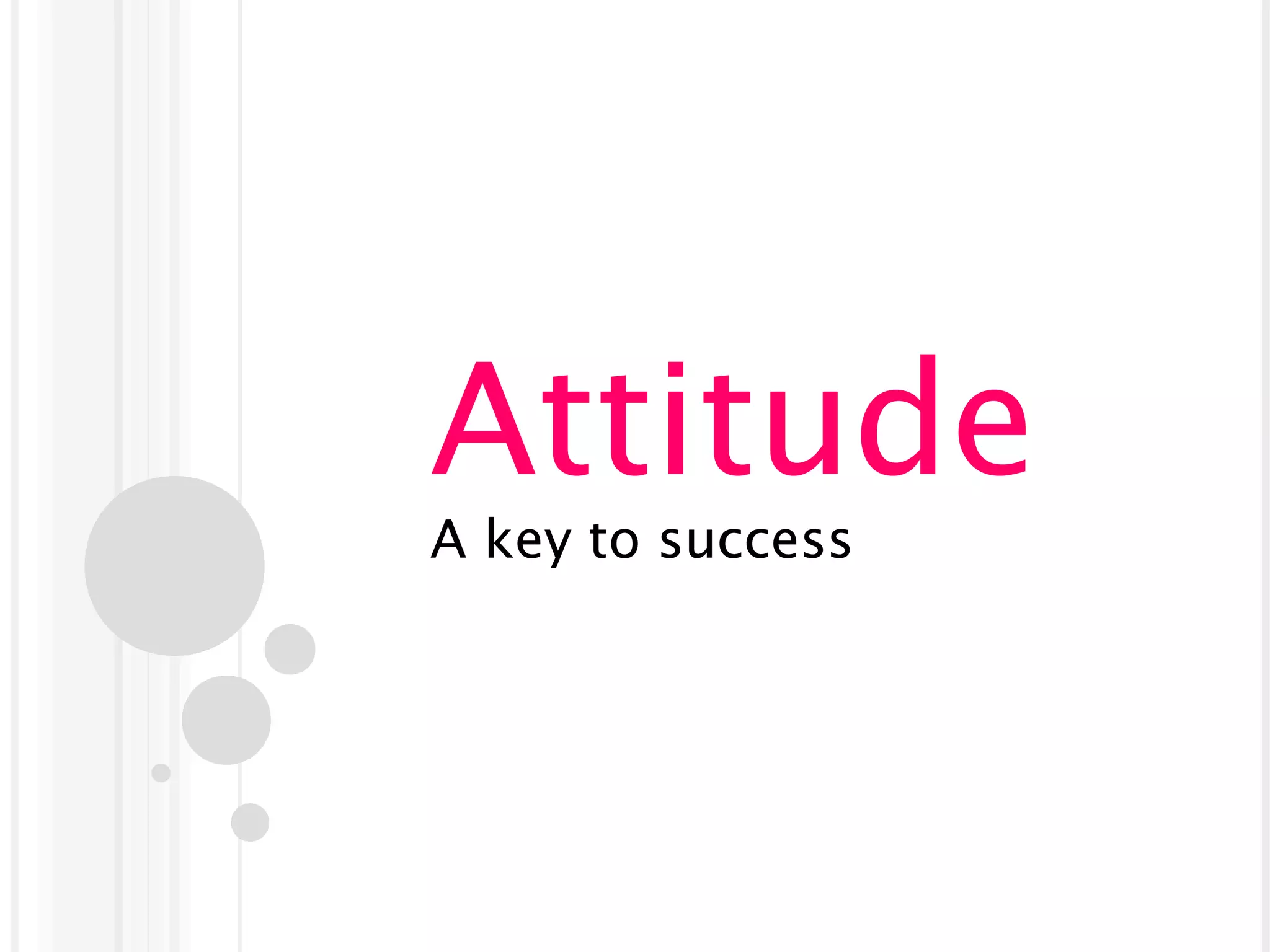 This document discusses attitude and its importance for success. It defines attitude as an individual's positive or negative feelings toward an object. Attitudes are formed through direct experiences, associations with others, mass communication, and more. Attitudes are represented through opinions, beliefs, and values. Only about 10% of one's attitude is visible through their behavior, while 90% remains unknown internally. Developing a good work attitude is important for success and can be achieved by having a positive mindset, not complaining, working hard, and planning work. Maintaining a good attitude plays a vital role.