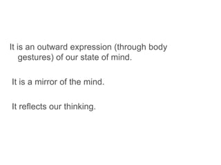 Attitude reflects one's thinking and is expressed through body language. A negative attitude believes success cannot be achieved, while a positive attitude believes success is possible. If one has been exhibiting a negative attitude and facing failures, it is time to change one's thinking. Hard work, skills, knowledge and attitude determine life to be 100% successful, with attitude being the most important factor. Having the right attitude and sharing knowledge and skills with others allows one to be known and successful.