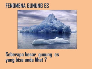 Dokumen ini membahas fenomena gunung es sebagai metafora untuk sikap manusia, di mana hanya 10% yang terlihat dan 90% tidak terlihat, mirip dengan pengetahuan dan keterampilan. Sikap dipengaruhi oleh emosi, persuasi, dan pengaruh sosial, dan memiliki dampak besar pada tindakan serta kesuksesan individu. Kunci untuk memiliki sikap yang baik adalah kemauan untuk berubah, yang menentukan potensi diri seseorang.