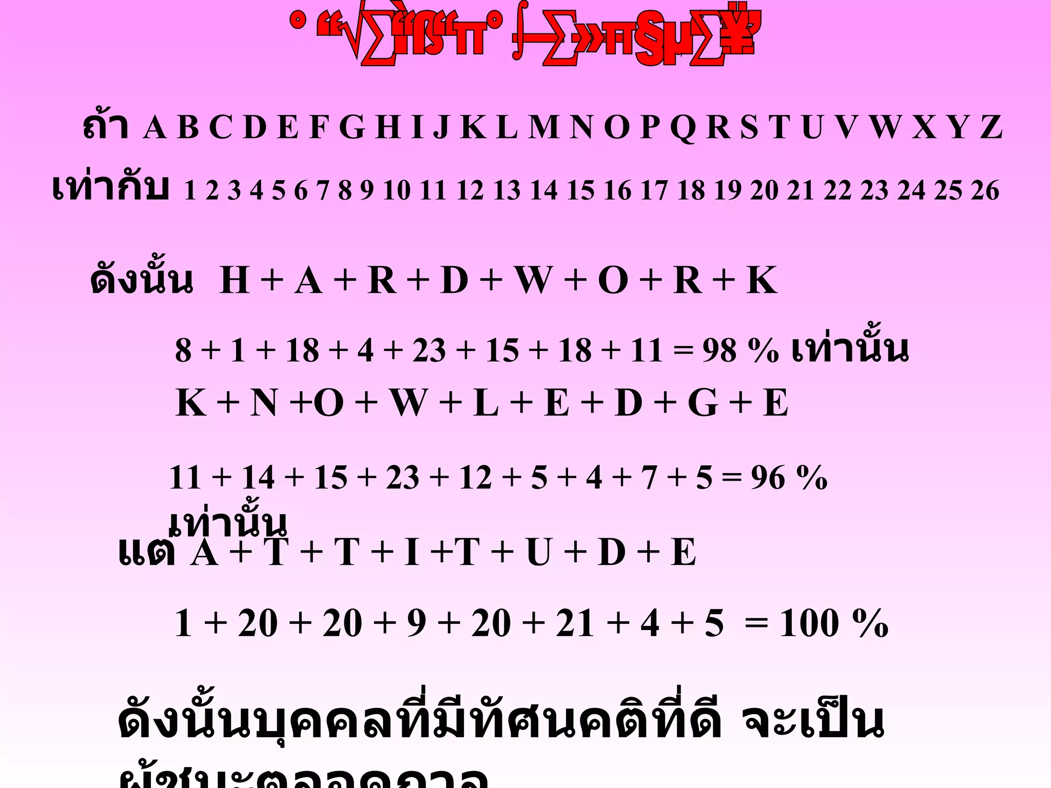 Attitude 1. 2. การทำงานกับทัศนคติที่ดี ถ้า A B C D E F G H I J K L M N O P Q R S T U V W X Y Z เท่ากับ 1 2 3 4 5 6 7 8 9 10 11 12 13 14 15 16 17 18 19 20 21 22 23 24 25 26 ดังนั้น H + A + R + D + W + O + R + K 8 + 1 + 18 + 4 + 23 + 15 + 18 + 11 = 98 % เท่านั้น K + N +O + W + L + E + D + G + E 11 + 14 + 15 + 23 + 12 + 5 + 4 + 7 + 5 = 96 % เท่านั้น แต่ A + T + T + I +T + U + D + E 1 + 20 + 20 + 9 + 20 + 21 + 4 + 5 = 100 % ดังนั้นบุคคลที่มีทัศนคติที่ดี จะเป็นผู้ชนะตลอดกาล 3. จุดประสงค์หลักของการทำงาน 1. ให้มีรายได้มาใช้จ่ายในครอบครัว 2. เพื่อแสดงความสามารถในการทำงานนั้น ๆ ให้บรรลุความสำเร็จ " หากเราทำงานที่มีค่า และทำงานด้วยการเห็นคุณค่าของ งานจะส่งผลให้ทำงานอย่างมีความสุข และผลิตผลที่ได้ จากการทำงานนั้นจะเกิดตามมามากมาย" 4. 5. 6. 7. 8. 9. 10. 11. 2. มีความสามารถ และเก่งในเรื่องคน รู้จักตนเอง เข้าใจคนอื่น ยอมรับความแตกต่าง ของคน เข้าใจการสื่อข้อ ความ 12. 3. มีความสามารถ และเก่งในการใช้ความคิด ควบคุมอารมณ์ได้ คิดอย่างมีเหตุผล คิดโดยยอมรับความจริง คิดอย่างเป็นระบบ 13. 4. มีความสามารถ และเก่งในการดำรงชีวิต ประหยัด อดออม ควบคุมความประพฤติปฏิบัติของตนเอง ซื่อสัตย์ น่าเชื่อถือ น่าไว้ใจ จัดเวลาให้ตนเองได้อย่างเหมาะสม 14. คุณสมบัติของคนยุคใหม่ ภาวะผู้นำ อัจฉริยะภาพสูง - รอบรู้ / รู้รอบ เก่งให้จริง รู้ให้เท่า / รู้ให้ทัน วิสัยทัศน์ มองไกล ก้าวไปอย่างมีทิศทางที่ถูกต้อง เข้าใจเชิงระบบ และเรียนรู้ร่วมกัน สร้างสินค้า และหาตลาด บริหารให้มีกำไร สานประโยชน์ สร้างเครือข่าย มีวินัย ยึดถือกฎระเบียบ ยึดหยุ่นได้ตามกาลเทศะ 15. 16. ความปรารถนาของนายจ้างจากลูกจ้าง 1. การทำงานเต็มเวลา 2. การทำงานเต็มประสิทธิภาพ 3. การทำงานตามคำสั่ง 4. การรักษาผลประโยชน์ของนายจ้าง 5. ความสามัคคีระหว่างผู้ปฏิบัติงาน 6. ความจงรักภักดี 7. ความเคารพ และยอมรับนับถือ 8. ความซื่อสัตย์สุจริต ความอุสาห และขยันขันแข็ง 10. ความคิดสร้างสรรค์ และเอาใจใส่พัฒนาตนเอง 17. 18. “ เซ็งวันจันทร์ รักวันศุกร์ สนุกวันเสาร์ เริ่มเหงาวันอาทิตย์แล้วกลับมาเซ็งอีกทีในวันจันทร์ ” พนักงานที่จะมีความก้าวหน้าในหน้าที่การงานได้ดี จะต้องตรวจสอบตัวเราเองว่าจัดอยู่ในประเภทใด เราต้องรีบแก้ไขจุดอ่อนของเรา และพัฒนาเสริมสร้างจุดดี ให้เกิดขึ้น เพื่อความสำเร็จในการทำงาน 19. พนักงานดีเด่น ทำงานแบบเฮงซวย ลาป่วยเป็นนิจ ลากิจเป็นประจำการงานชอบเลี่ยง ส่งเสียงชวนคุย ทำชุ่ยอยู่เสมอ ชอบเผลอนอนหลับ มักกลับก่อนเวลา มาสายตลอดปี ธุระมีตลอดวัน หน้าด้านเอาเงินเดือน ใครเตือนก็ไม่ฟัง ซ้ำนั่งไม่ติดที่ งานมีทำไม่สำเร็จ บำเหน็จก็จะเอา หน้าเง้าเมื่อไม่ได้ 20. วินัย และ คุณธรรมในการทำงาน การที่เราจะรักบริษัท ฯ ของเรา รักในงานที่เราทำได้นั้น เราจะต้องมีความร