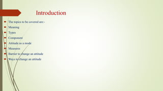 This document discusses attitude, including its meaning as a way of thinking or feeling, types (positive, negative, neutral), components (cognitive, affective, behavioral), measures (explicit, implicit), barriers to changing attitude (prior commitment, insufficient information, resistance to change), and ways to change attitude (admit need for change, choose optimism, use positive language, surround yourself with positive people, use daily affirmations).