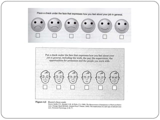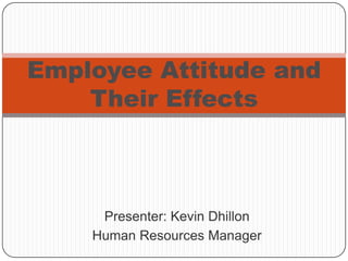 Employee attitudes, like job satisfaction, can impact organizational outcomes. Attitudes have cognitive, affective, and behavioral components and can be measured through surveys. Job satisfaction depends on factors like meaningful work, fair compensation, and a good work environment. Satisfied employees tend to be more productive, committed, healthy, and loyal, which benefits the organization. Changing attitudes requires understanding their causes and using strategies like information sharing, addressing inconsistencies, and influencing social groups. Regular attitude surveys provide management insights for improving job satisfaction.