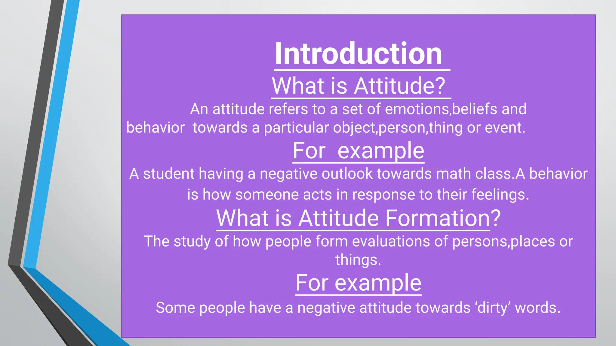 Attitude refers to a set of emotions, beliefs, and behaviors toward an object, person, thing, or event. Attitude formation is the study of how people develop evaluations of various things. Attitudes are influenced by factors such as direct experience, social norms, and learning. Attitudes have three components - cognitive, affective, and behavioral. Attitudes are relatively stable over time but can change through methods like self-perception, learning theory, cognitive dissonance, and persuasion. Society also influences attitudes through factors like family, education, media, economic status, and direct instructions. Consumer attitudes impact product preferences and likelihood of purchase.